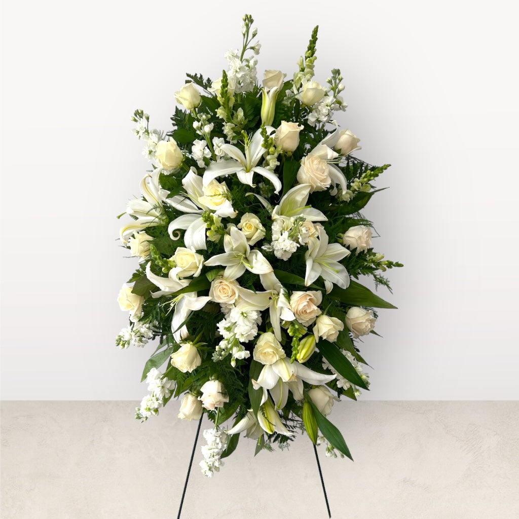 This elegant and serene funeral spray, aptly named "A Cascading Symphony of Purity and Peace," embodies the enduring peace, innocence, and cherished memories that the deceased will forever hold in the hearts of those who cherished them. A harmonious blend of pristine white lilies, delicate white roses, and vibrant white freesias gracefully cascades downwards, symbolizing tranquility, happiness, and the enduring bond that the deceased shared with those they cherished.