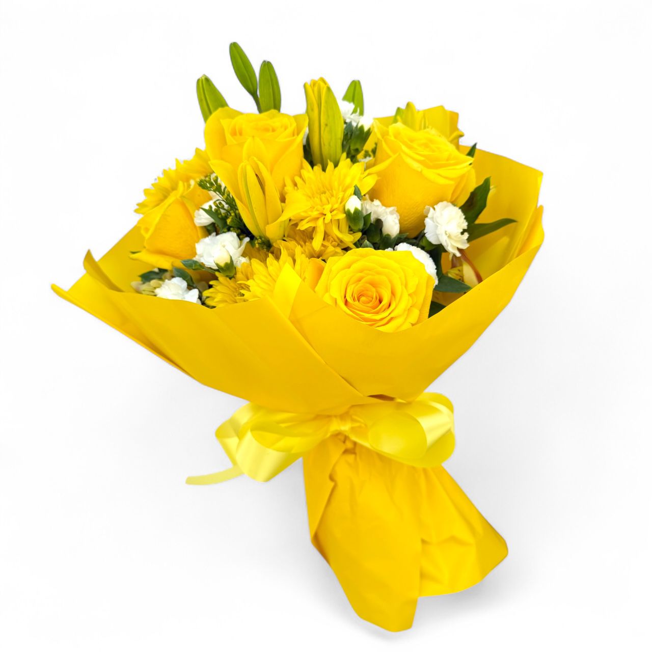 Bring warmth and joy to any occasion with our Golden Sunshine Bouquet, featuring radiant yellow roses, lilies, and daisies accented with delicate white blooms. Wrapped in bright yellow paper and finished with a satin bow, this cheerful bouquet is the perfect gift for birthdays, celebrations, or simply to brighten someone’s day.