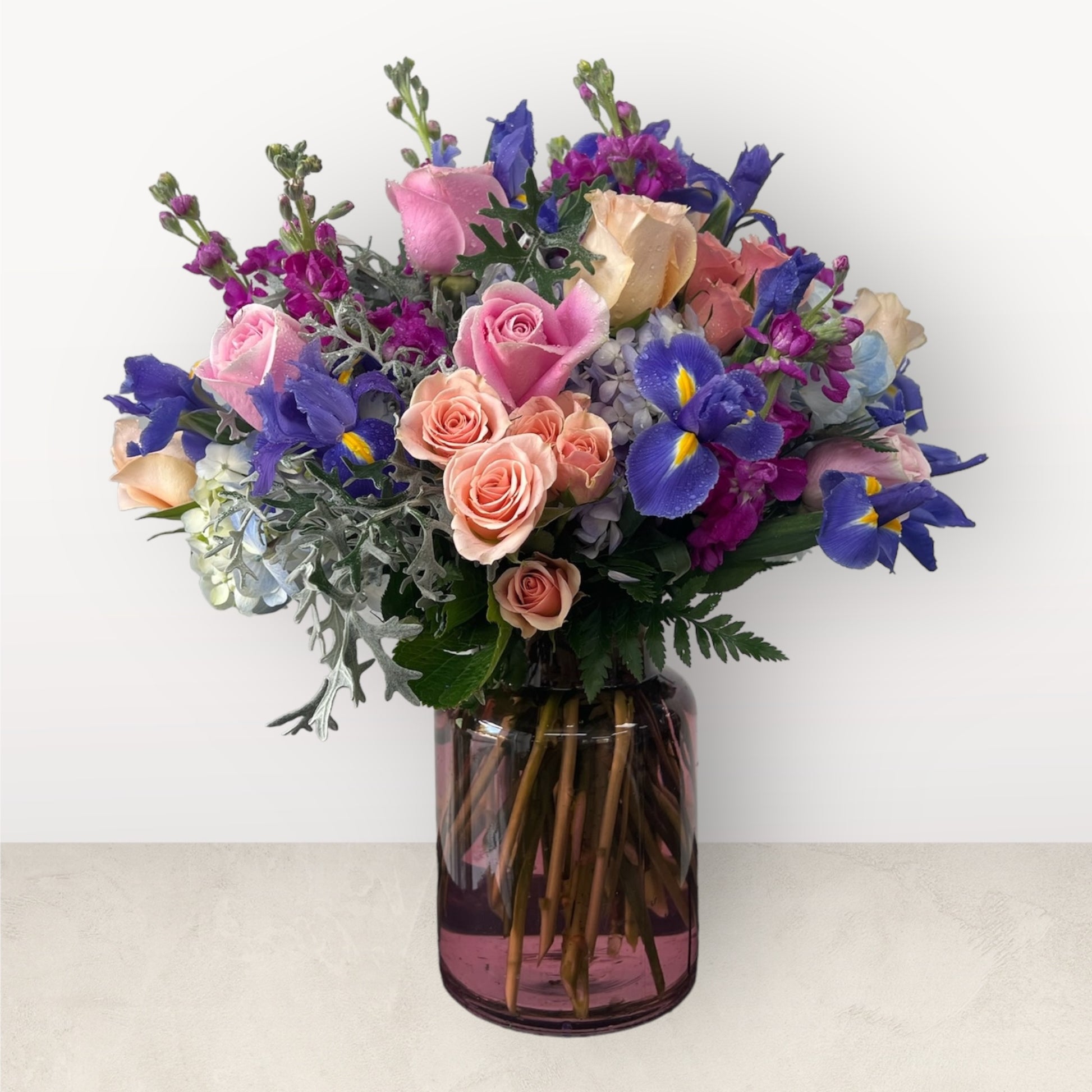 This is a stunning and romantic bouquet featuring a harmonious blend of soft pastels and deep jewel tones. The centerpiece is a collection of delicate pink roses, arranged in varying shades from blush to deep rose. These are complemented by elegant purple irises and vibrant blue delphinium, creating a visually striking contrast. The addition of soft blue hydrangeas and dusty miller provides a touch of texture and volume, tying the arrangement together. The bouquet is presented in a simple, yet elegant, clear glass vase, allowing the beauty of the flowers to shine.