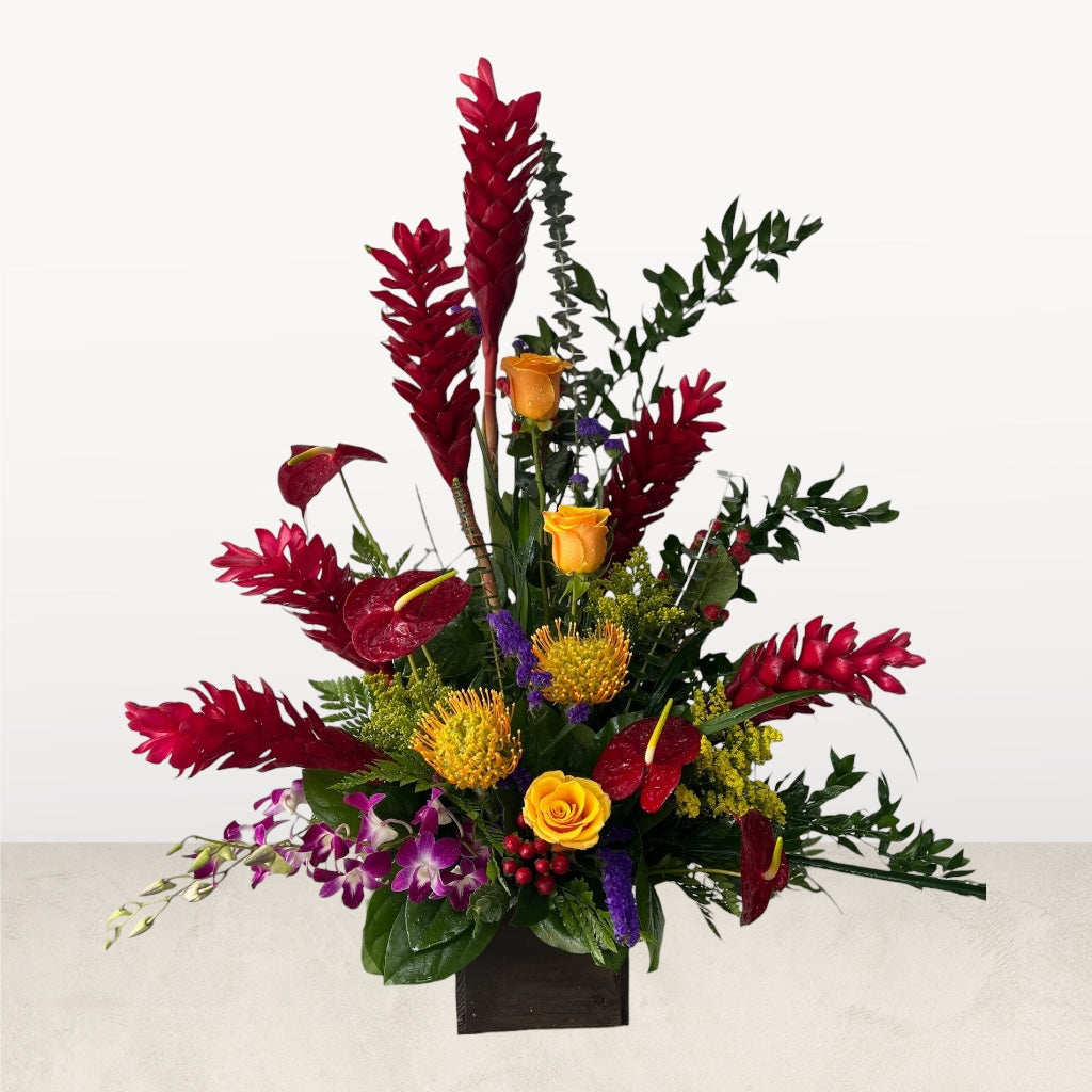 This vibrant and exotic arrangement is a stunning display of tropical colors and textures. The focal point is undoubtedly the tall, dramatic red ginger flowers, which create a striking vertical element. These are complemented by the elegant curves of orange roses, the exotic beauty of anthurium flowers, and the delicate elegance of purple orchids. The addition of yellow pom poms and lush greenery, such as leatherleaf fern, adds depth and texture. The overall effect is one of opulence and luxury, making it a perfect choice for a special occasion or as a statement piece.