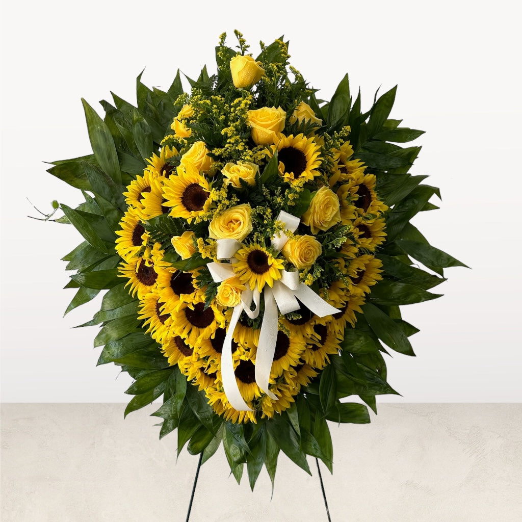 This stunning standing spray is a vibrant masterpiece featuring a heart-shaped arrangement of sunflowers. The radiant yellow petals of the sunflowers are beautifully contrasted against a lush green backdrop, creating a visually striking and uplifting display. This arrangement symbolizes warmth, adoration, and the enduring nature of life. The standing design allows the flowers to cascade gracefully, making it a focal point for any space. This is a perfect choice to honor the memory of a loved one or to celebrate a special occasion.