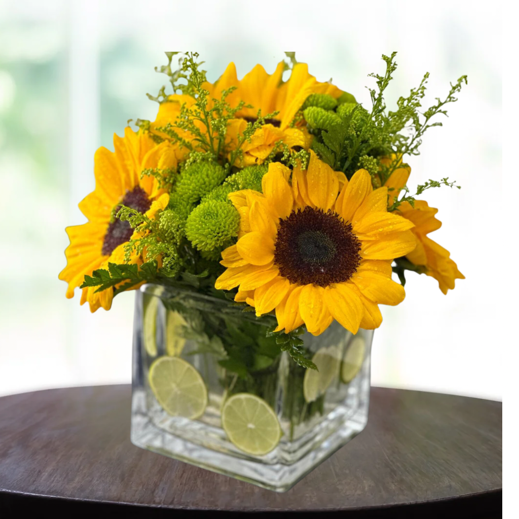 This arrangement is the perfect combination, sunflowers, and green buttons will give any space a unique touch of elegance