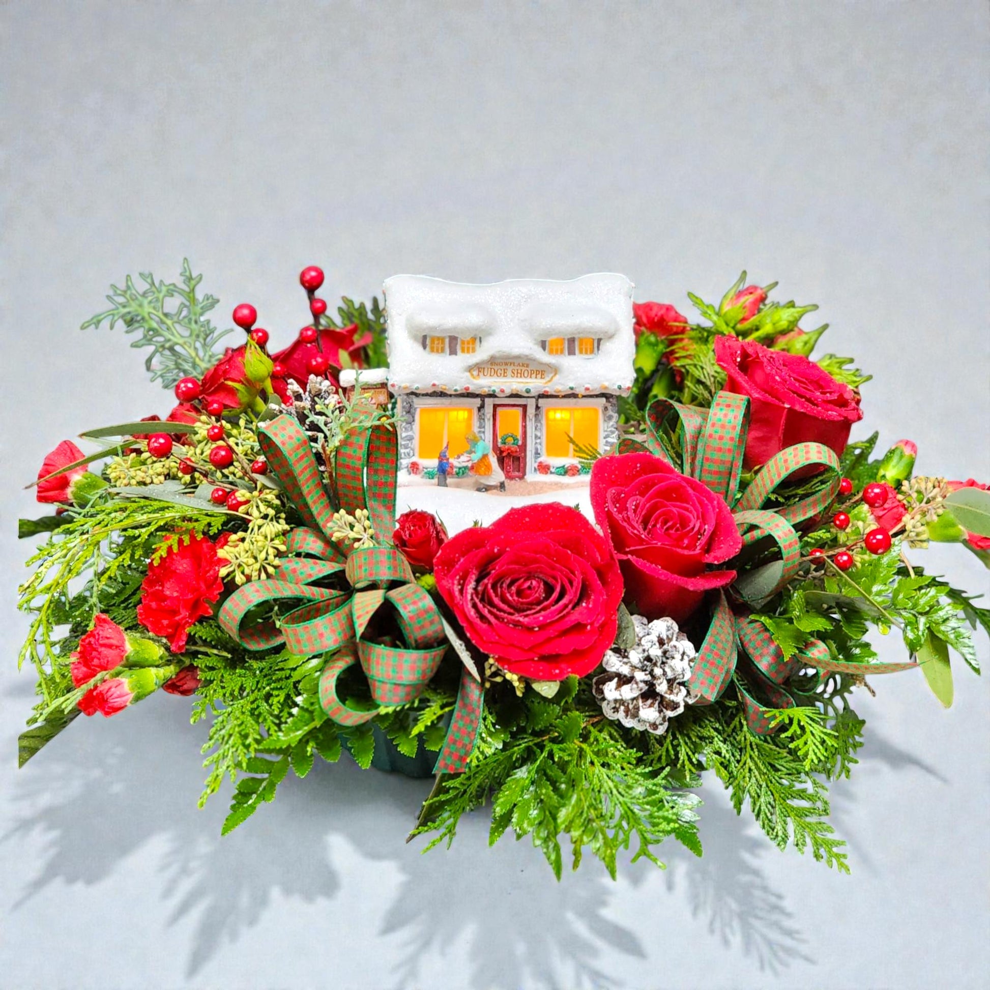 A joyful winter garden with roses, berries, fresh evergreens, and a tiny illuminated cottage—a reminder of home, memory, and holiday wonder.