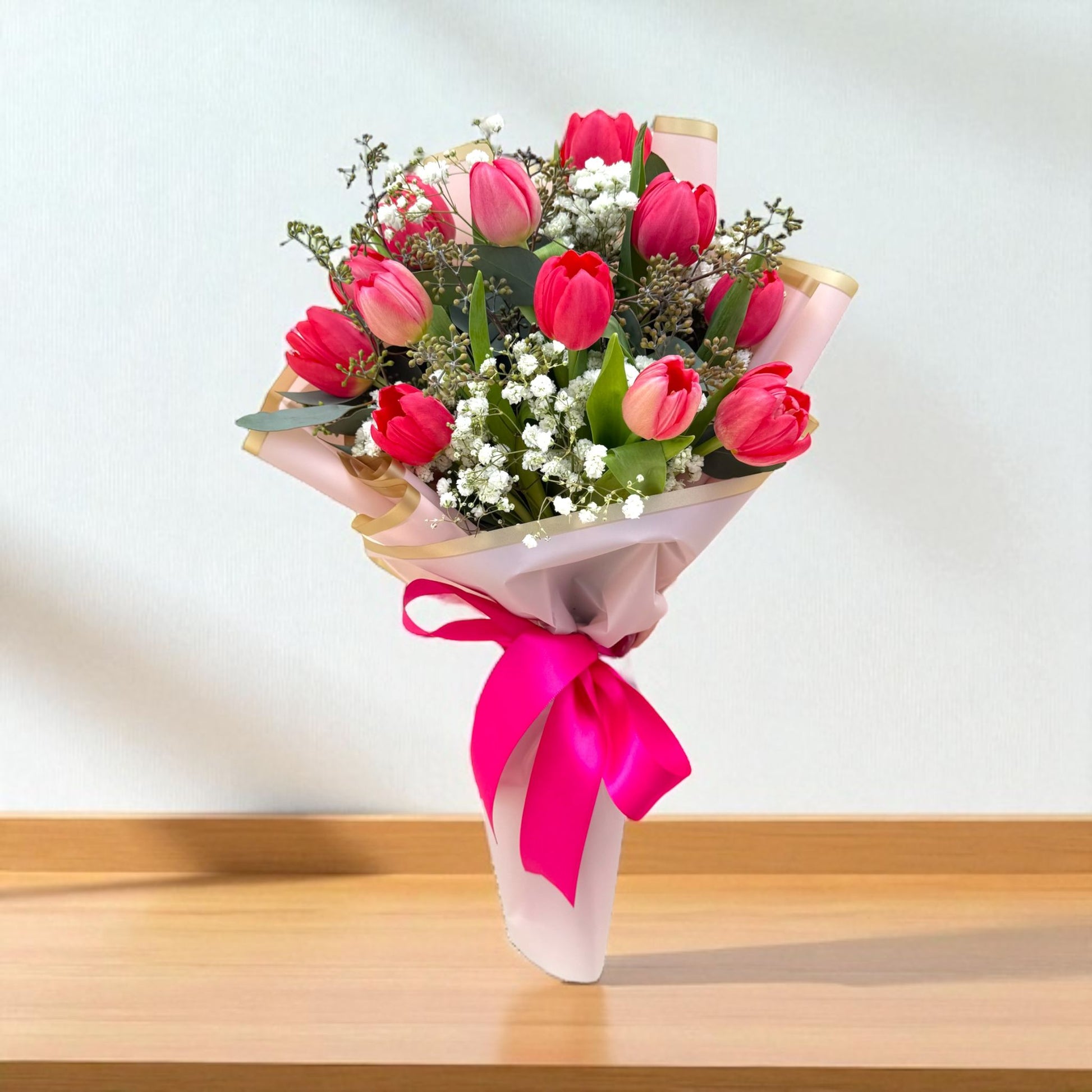 An elegant bouquet of red and pink tulips, beautifully complemented by delicate white baby’s breath and vibrant green foliage. Wrapped in decorative pink paper with a golden edge and tied with a satin pink ribbon, this arrangement is perfect for expressing love, gratitude, or celebrating special moments. Its sophisticated design and vibrant colors make it an ideal gift for any occasion.