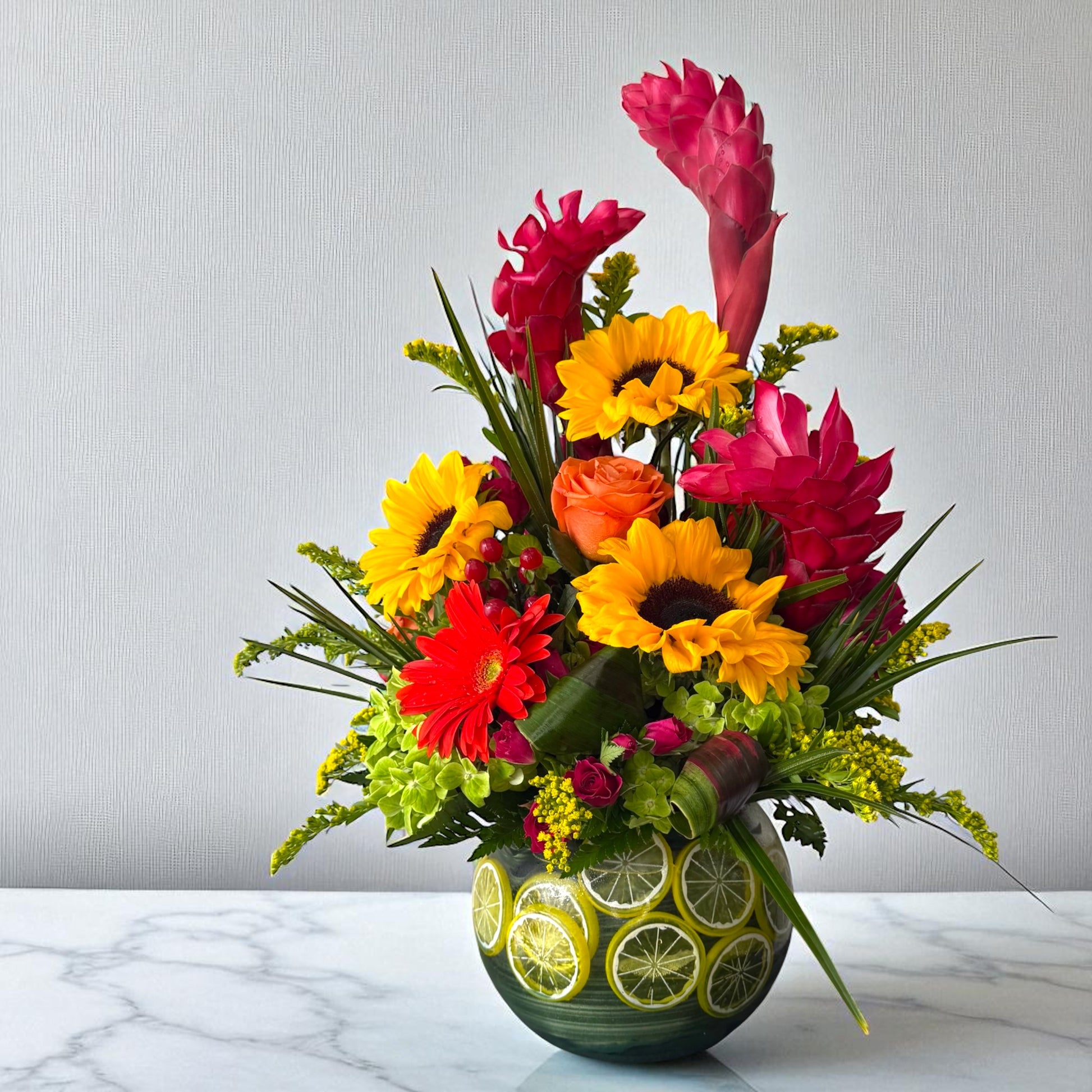 This vibrant round floral arrangement combines the energy of sunflowers, orange gerberas, and roses with the freshness of green hydrangeas and the tropical touch of red ginger. Yellow solidago adds texture and an extra pop of brightness to the design. Presented in a vase decorated with lemon slices, this arrangement is perfect for celebrations, events, or to bring a fresh, tropical, and perfectly balanced vibe to any space.