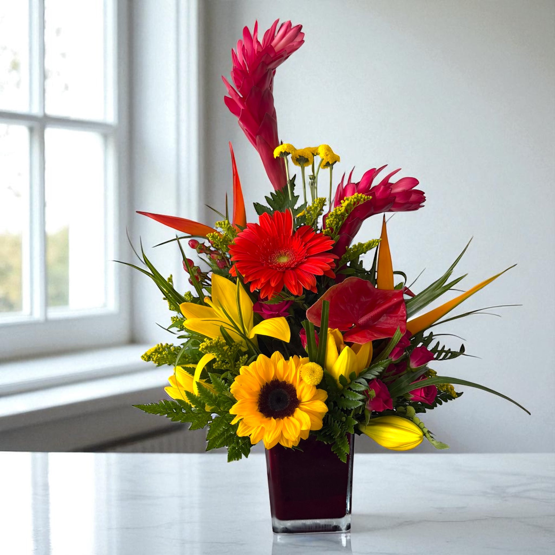 This stunning floral arrangement combines the energy of fuchsia spray roses, orange gerberas, and the tropical intensity of red ginger and heliconias. A vibrant yellow sunflower with a dark center takes center stage, while lush green foliage and ferns add texture and depth. Presented in an elegant dark red square glass vase, this design is perfect for celebrations, gifts, or bringing an exotic and vibrant touch to any space.